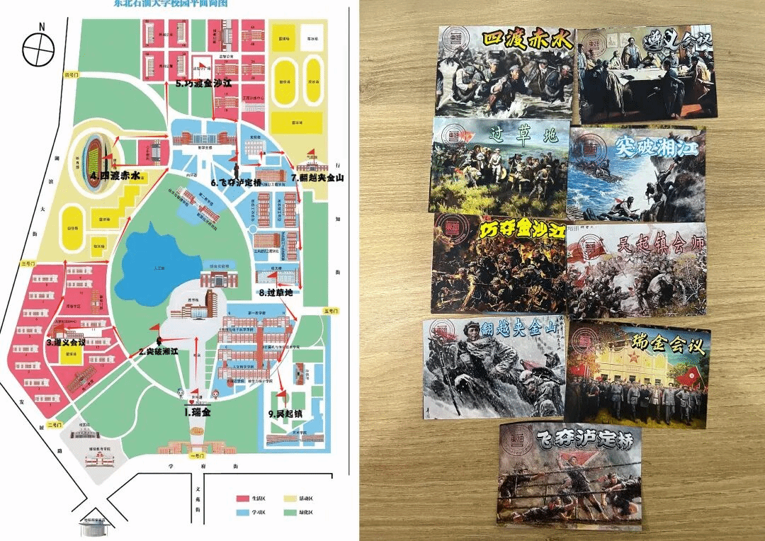 此次活动路线选取了长征途中具有代表性的一段路程,首先从校园正门“瑞金”开始第一站,到达校园铁人纪念雕像,代表着“湘江”,突破“湘江”后抵达“遵义”开启“长征”转折点,随后通过“赤水”,“金沙江”,“泸定桥”,“夹金山”,“过草地”最终抵达“吴起镇”并回到艺术学院。每一段长征路上的关卡都在校园环路上一一体现。一路上,同学们沿着红军当年的足迹前行,在校园的环路里感受着那段波澜壮阔的革命历史。