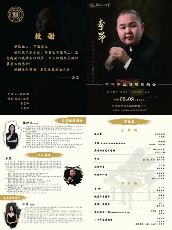 李昂在校期间曾经获得东北石油大学“优秀团员”、“优秀青年志愿者”和“优秀学生干部标兵”等称号,曾任艺术学院第十八届学生会主席,是一位品学兼优的毕业生。音乐会的成功举办不仅展示了李昂本科四年的专业才能,也体现了艺术学院在人才培养上的实践教学成果。