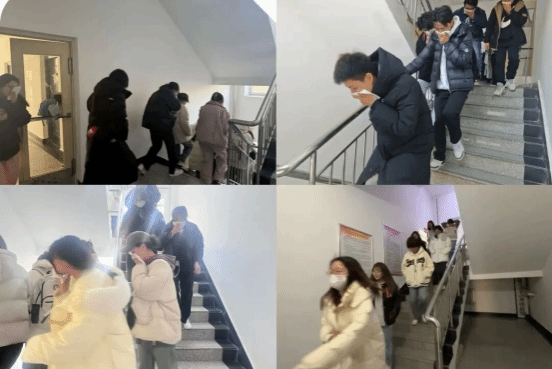 下午两点三十分,随着宿舍楼内警报声骤然响起,消防演练正式拉开序幕。学生们反应迅速,用湿毛巾捂住口鼻,弯腰低姿沿着防火逃生应急疏散演练路线有序撤离。各楼层工作人员早已到位,他们沉着冷静地指挥着学生,确保疏散过程不出现混乱和拥挤。疏散过程紧张有序,撤出寝室的学生到达安全区后,以班级为单位,各班班长立即进行人数清点,确保每位学生都已安全撤离。整个应急演练有条不絮,达到了预期的效果。