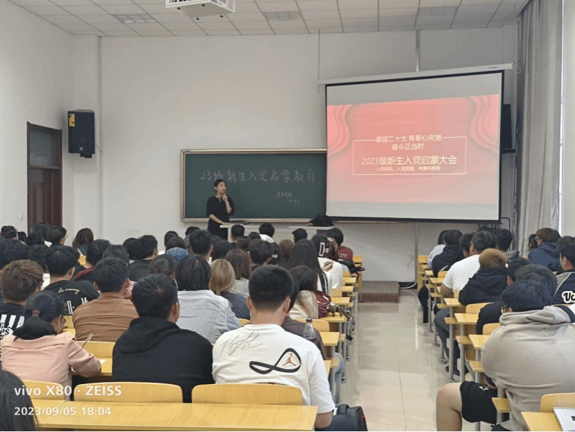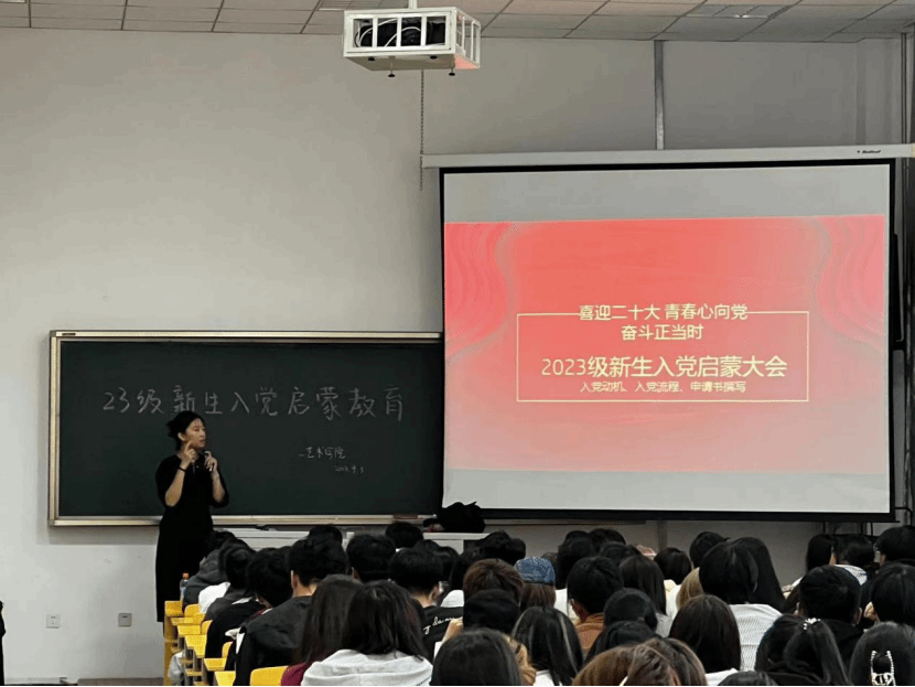 2023年9月5日晚18点,艺术学院2023级新生入党启蒙教育大会在美术楼104教室举行。本次活动由艺术学院大学生党支部书记吕明珠老师主讲,主题是“坚定入党信念,打好奋斗底色”。吕明珠老师从党的发展历程、入党申请书的撰写、入党流程和建设远大理想抱负四个方面进行了深入解读和讲解。