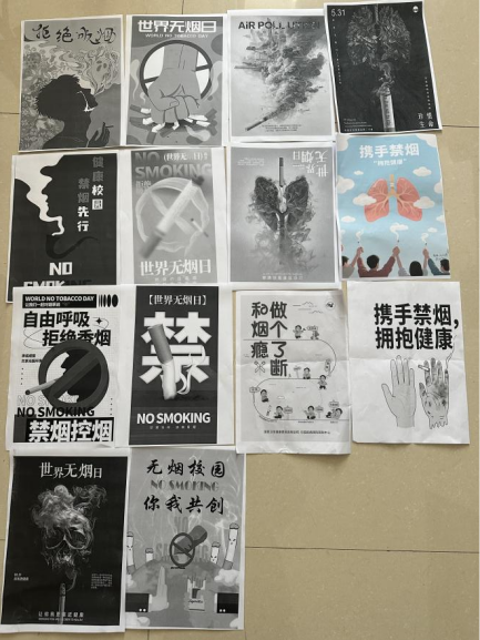 活动接近尾声,所有同学齐聚一起拍摄大合照为此次活动留下纪念。而展示区张贴着所有同学设计的戒烟宣传海报黑白打印版,清晰呈现出同学们对禁烟的思考与创意。