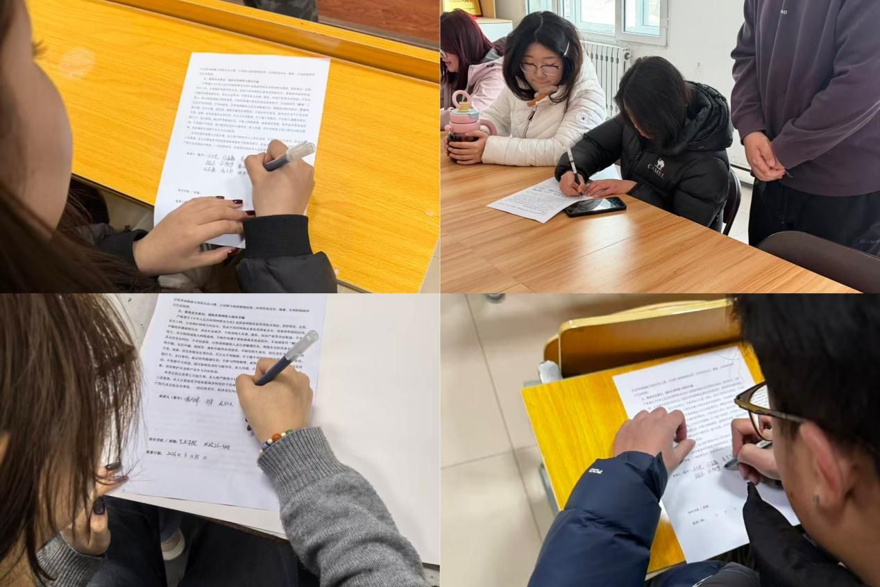 活动开展过程中,各班级以主题班会形式,组织学生认真学习责任状全部内容,涵盖用电安全、禁毒防毒、交通安全、禁烟管理、网络安全及防诈骗六大核心方面,对学生日常行为规范作出具体且严格的规定,明晰自身在校园安全中的责任与义务。