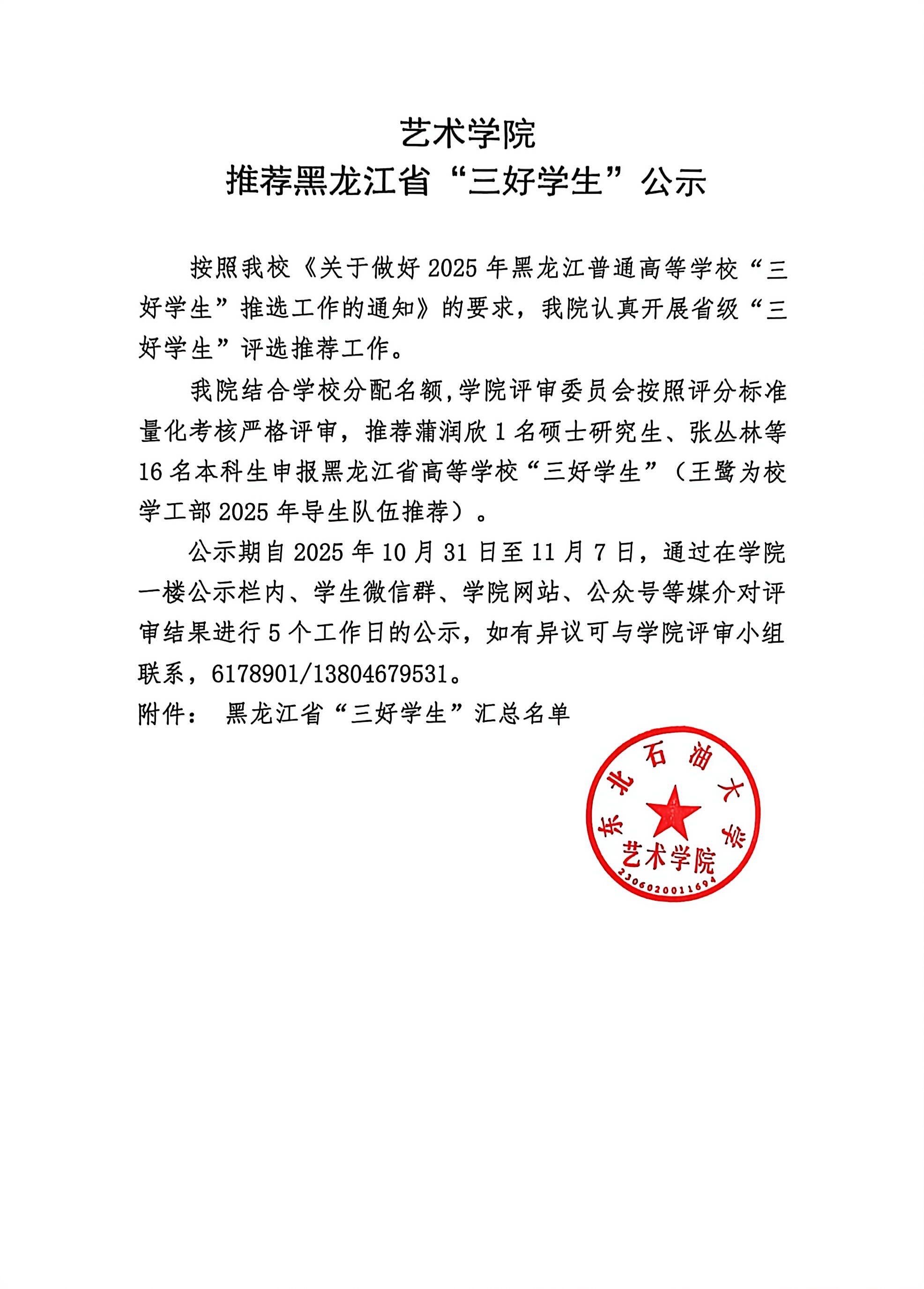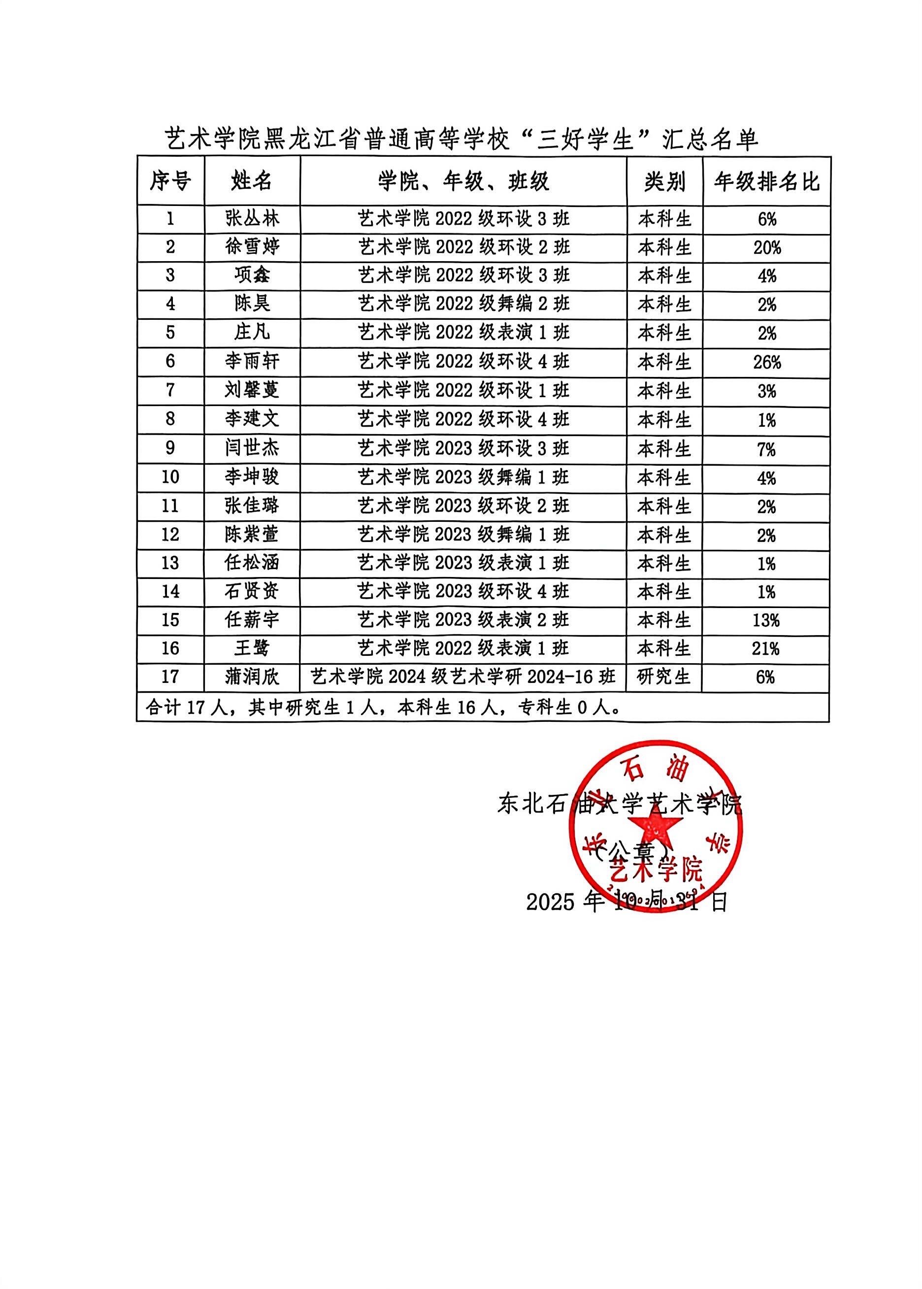 艺术学院推荐2025年黑龙江省“三好学生”公示名单